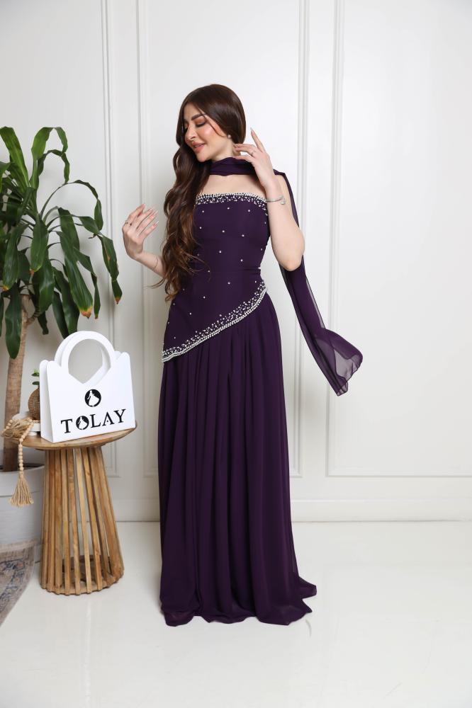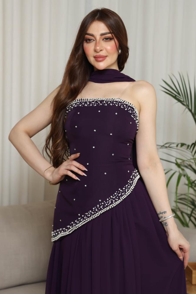 فستان باربي من الصدر بكورسيه مايله من الجنب ومطرزه بالكريستال يتميز بخامتين نااعمه الباربي والشيفون من الاسفل بقصة الكلوش