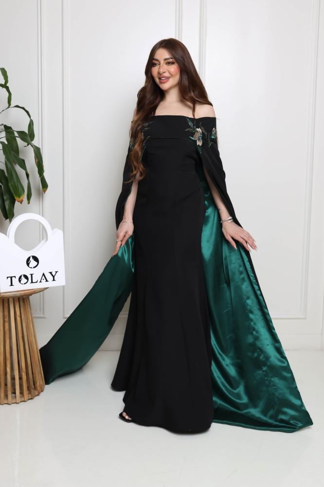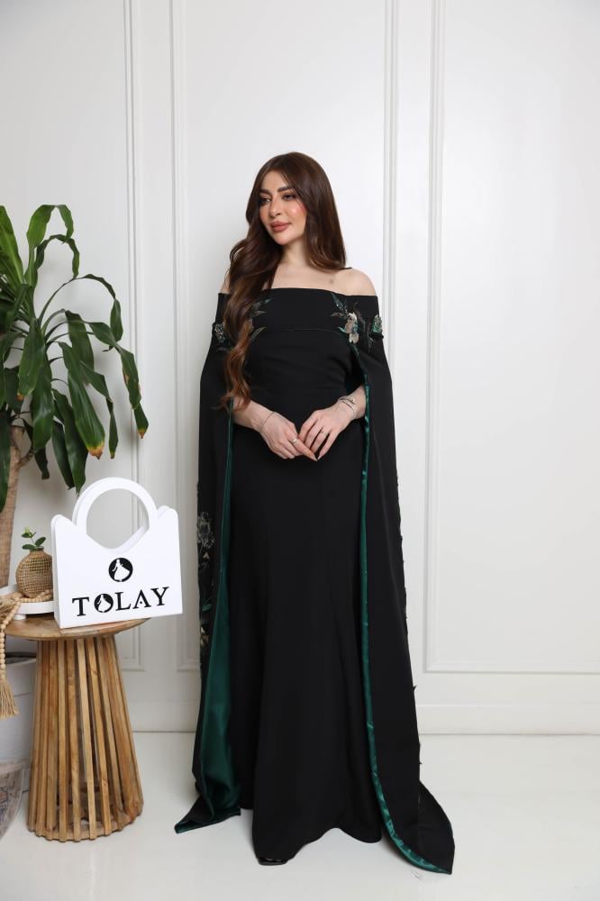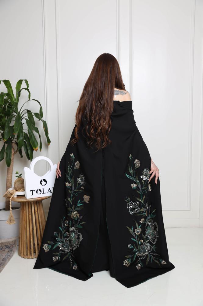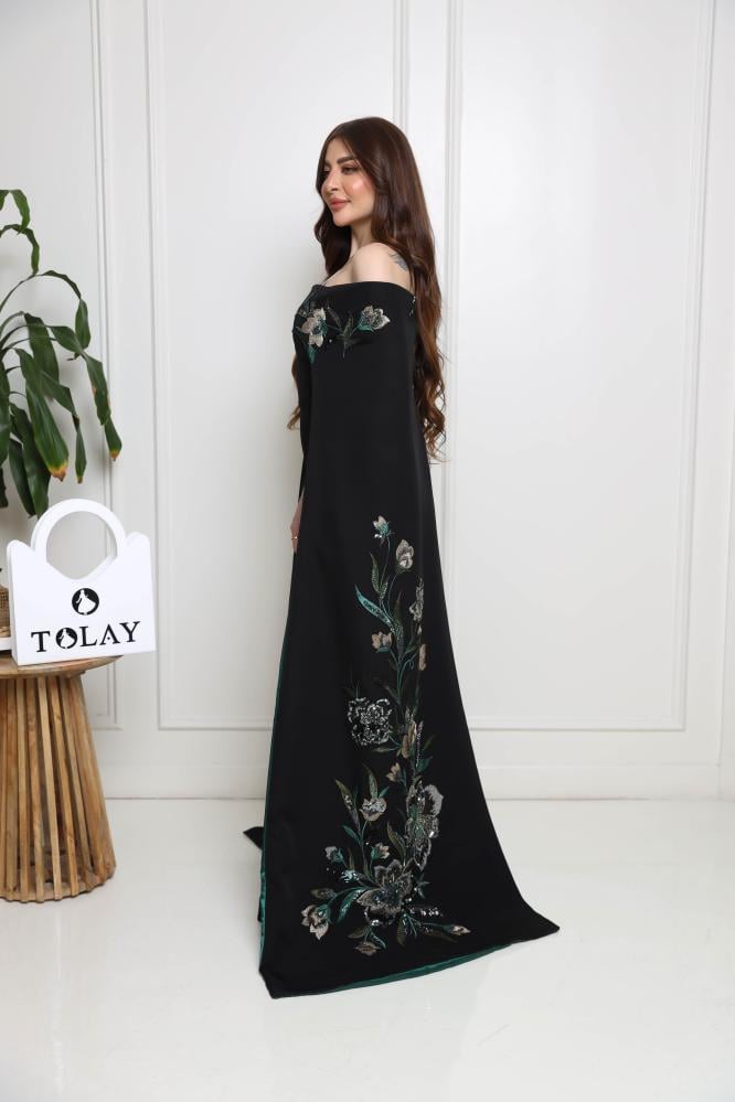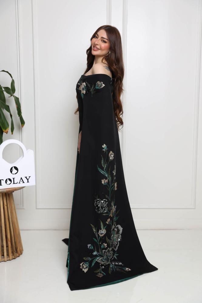 فستان راقي من تولاي بقصة حصرية انيقه باللون الاسود وبتدخلات انيقه متناسبه مع الكلفه بطريز ورود مشبعه بالالوان الراقيه ياتي الفستان بقصة حصريه من تولاي بقصة ماسكه للفستان ومن الخلف بشكل بشت منفصل مبطن بالوان تناسب التطريز وبقصة صدر تب مع اوف شولدر متصله بالخلف